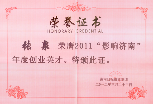 2012年3月24日,由济南日报报业集团和舜网主办的2011“影响济南”年度经济人物颁奖典礼在舜耕山庄隆重举行。公司董事长张泉荣膺2011“影响济南”年度创业英才,成为文化出版领域获得这个荣誉的唯一个人。济南市委常委、宣传部长谭延伟,济南市人大常委会副主任邹世平,济南市副市长张海波等领导同志出席颁奖仪式。
